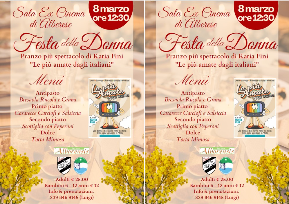 Notizie Alberese Sala ex Cinema Festa della donna 8 marzo alle ore 12:30 Pro Loco Alborensis - 28 February 2026 Add new comment Your name Subject Comment About text formats Plain text No HTML tags allowed. Lines and paragraphs break automatically. Web page addresses and email addresses turn into links automatically.