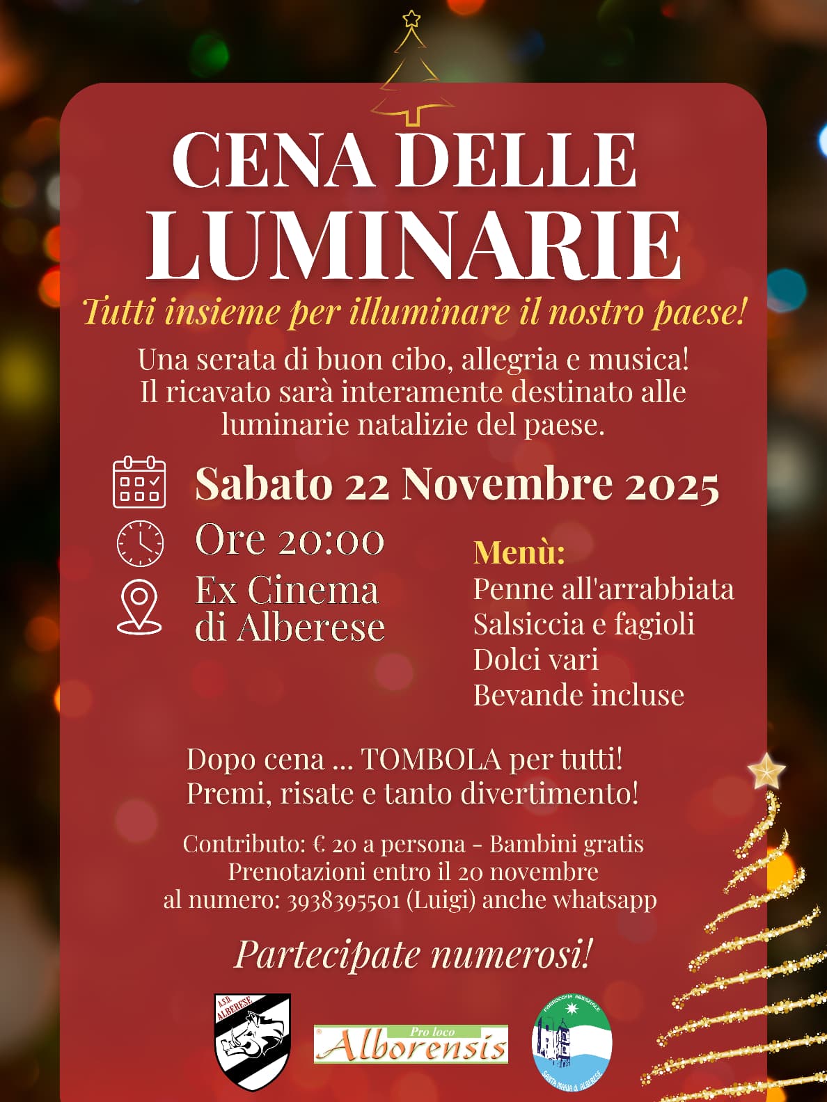 Eventi Cena delle Luminarie il 22 novembre alle ore 20:00 presso l'ex cinema di Alberese Pro Loco Alborensis - 1 November 2025 Aggiungi un commento Il tuo nome Subject Comment Riguardo ai formati testo Plain text Nessun tag HTML consentito. Linee e paragrafi vanno a capo automaticamente. Indirizzi web ed indirizzi e-mail diventano automaticamente dei link.